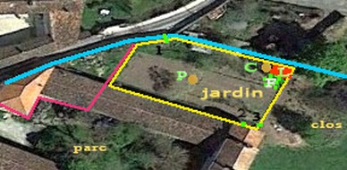 Le poulailler (L), plus quelques cages à lapins. J’y attrapais régulièrement des poux de poule chaque fois que j’y traînais un peu, mais ça ne m'arrêtait pas vraiment, et  j’y étais souvent fourré. Je me souviens d’une poule rousse particulièrement familière, «la cou doré», qui nous suivait partout
