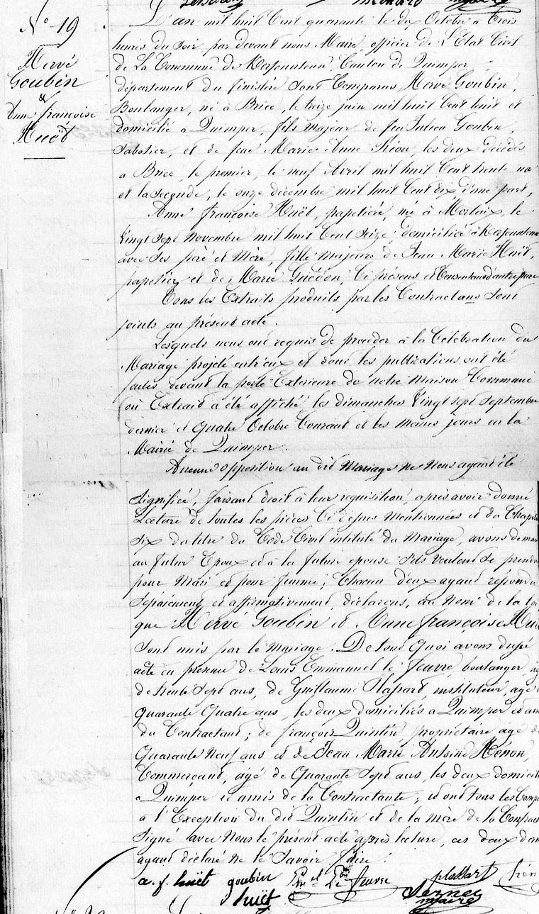 L’an mil huit cent quarante le dix octobre à trois heures du soir, par devant nous maire, officier de l’État Civil de la commune de Kerfeunteun canton de Quimper département du Finistère sont comparus Hervé Goubin, boulanger, né à Briec le treize juin mil huit cent huit et domicilié à Quimper, fils majeur de feu Julien Goubin sabotier, et de feue Marie Anne Riou, les deux décédés à Briec, le premier le neuf avril mil huit cent trente et un et la seconde le onze décembre mil huit cent dix d’une part, Anne Françoise Huët, papetière, née à Morlaix le vingt sept novembre mil huit cent seize, domiciliée à Kerfeuteun avec ses prère et mère, fille majeure de Jean Marie Huët, papetier et de Marie Guédon, ci-présent et consentant d’autre part.