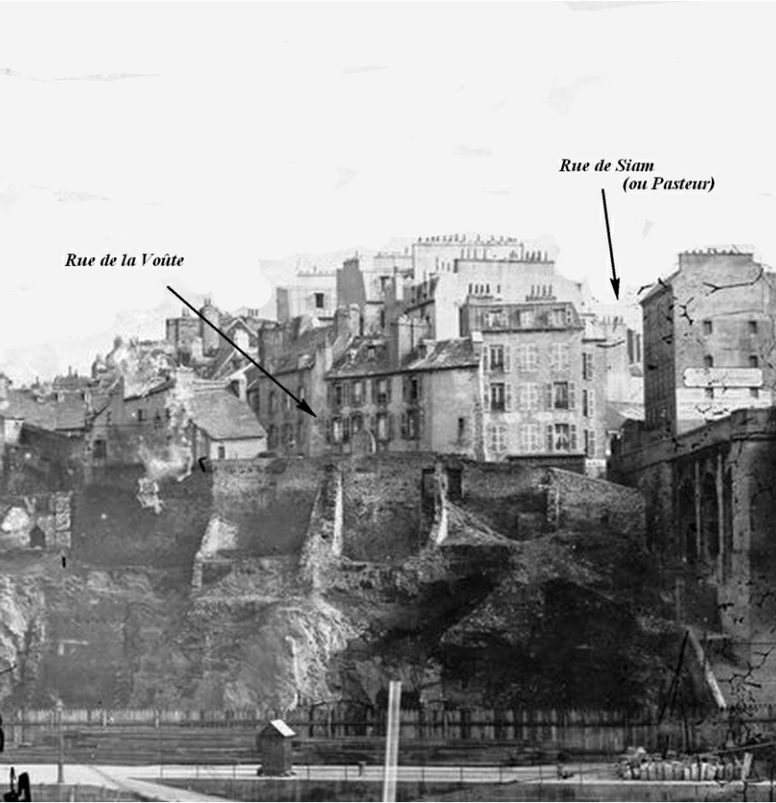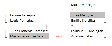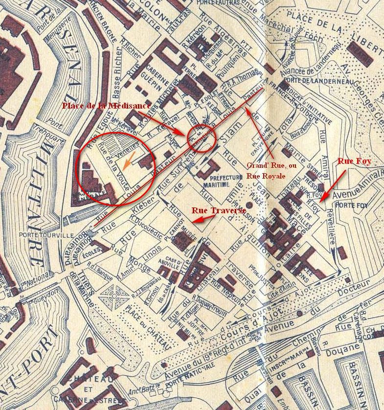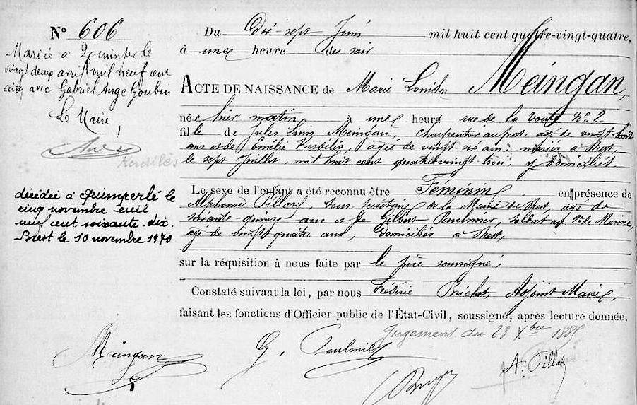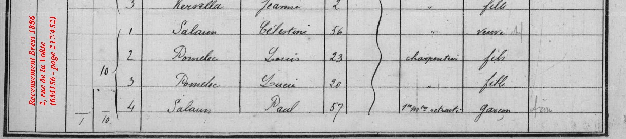 Domicile déclaré: 2 rue de la Voûte à Brest Il est difficile de savoir si cette adresse est la bonne. En effet, Jules Meingan est réputé vivre au 4 rue de la Voûte (listes électorales de 1882, 1883, 1888), mais on ne trouve rien le concernant ni au 2, ni au 4, sur les états de recensement. Au recensement de 1886, on trouve au n°2: Salaun Célestine (56 ans veuve) , Pomelec Louis (23 ans charpentier, fils), Pomelec Lucie (20 ans fille), et Salaun Paul (57 ans, 1er Me retraité, frère). Soit Jules Meingan et sa famille ont utilisé cette adresse comme une adresse de complaisance, soit ils vivaient là. (Célestine Salaun était une tante de Jules Meingan. voir schéma). La « Rue de la Voûte » apparaît dans de nombreux documents familiaux de cette époque